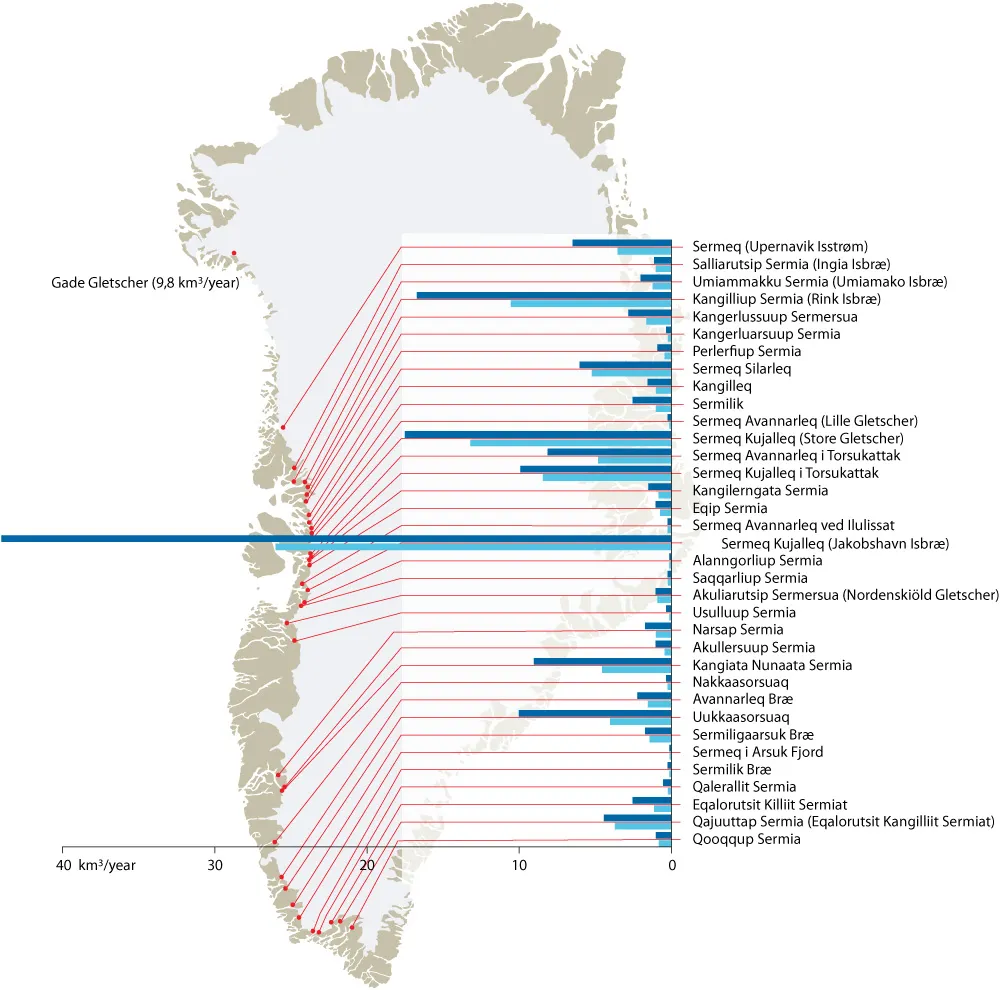 Estimates of the annual production of calf ice from Sermeq Kujalleq rely primarily on knowledge of the flow velocity of the ice and the thickness and width of the calving front.