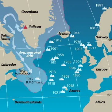 In the period from March to October 1982, calving and iceberg production was closely followed using data from satellite remote sensing. Three major calving events occurred. The largest produced 14 tabular icebergs, with sizes up to 2 km by 1 km. This event resulted in the estimated discharge of 8.4 cubic kilometres of ice and a retreat of the glacier front by about 2 km, and was associated with the break-up of the sea ice in the inner part of Kangia. Another pronounced calving, with the detachment of large tabular icebergs, was observed in July 1985 when the outer 2 km of the floating part of Sermeq Kujalleq disintegrated in the course of just 45 minutes.