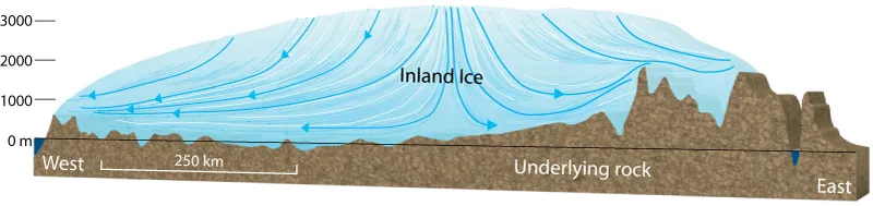 Cross section of Greenland, showing the thickness of the Inland Ice. In the central part the ice is more than 3 kilometres thick. Note that the deepest part of the ice is lying below sea level. Flow lines show how the ice is moving from the inner parts towards the margin. Click on the image enlarge it.