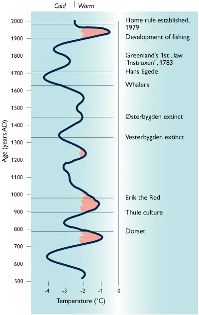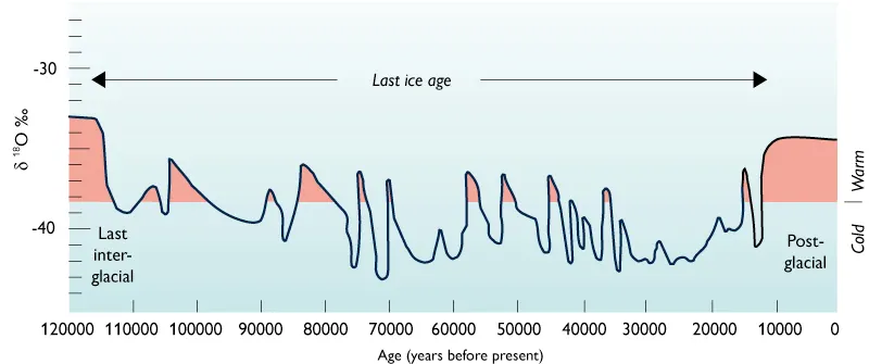 The last ice age ended abruptly about 11,550 years ago, and the climate in the present warm interglacial period has been relatively stable. The warm interglacial culminated from 8000 to 4000 years ago, and was followed by falling temperatures with two particularly cold periods about 1600 and 1850, the so called ‘Little Ice Age’; average temperatures were then 1°C colder than today.