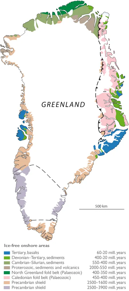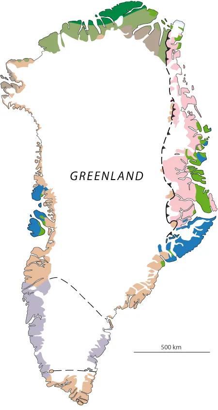 The Precambrian shield is dominated by pale grey, folded, gneisses and granites, with bands and enclaves of mica schist and dark basic rocks. The bedrock is widely exposed along the whole of the ice-free part of western and southern Greenland, but the Inland Ice conceals the bedrock of 81% of Greenland.