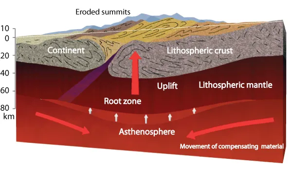 Cross-section showing how the base of the lithosphere is depressed during mountain building. As the tops of the mountains gradually erode, the load on the underlying asthenosphere decreases, so the remaining rocks in the mountains rise gradually upwards and material in the asthenosphere flows inwards. (Illustration: Carsten E. Thuesen) Click on the image to enlarge it.