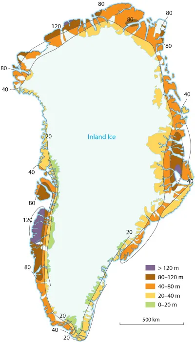The last ice age culminated 21,000 years ago, and the world’s ice sheets have subsequently either disappeared or diminished in size, with the consequent contribution of meltwater causing the level of the world’s oceans to rise by 135 metres. Areas of Greenland that were once covered by ice have been raised above sea level due to uplift. In West Greenland, for example, the presence of raised marine and coastal deposits in the present day ice-free land areas are evidence of land uplift.