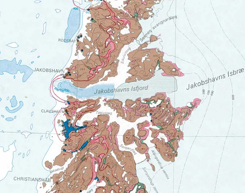 Major moraines (red lines) in the Ilulissat region. The moraines related to ice recession are shown in pink. Marine deposits are shown in blue and lake sediments in green. The former (19th century) extent of Sermeq Kujalleq (Jakobshavn Isbræ) is shown with blue-grey horizontal lines. Marine deposits are shown in blue and freshwater deposits in green. Reproduced from a published 1974 map sheet, that uses the former Danish names for Qasigiannguit (Christianshåb), Ilimanaq (Claushavn), Ilulissat (Jakobshavn), Kangia (Jakobshavn Isfjord) and Sermeq Kujalleq (Jakobshavn Isbræ). Click on the image to enlarge it.
