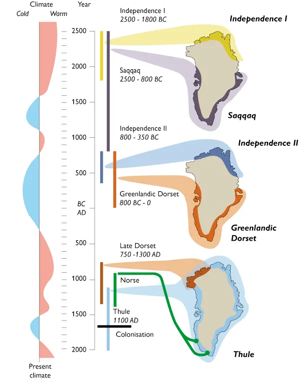 Palaeo-Eskimos, equivalent to the Stone Age cultures of Europe, are represented by four cultures in Greenland. The Saqqaq and Dorset people lived in West Greenland, while the Independence I and Independence II people settled in the northern and north-eastern parts of Greenland. All of the palaeo-eskimo cultures migrated eastwards across Canada, reaching North-West Greenland in the Thule area. From here the Saqqaq and the Dorset people moved down the west coast and established settlements at suitable locations.