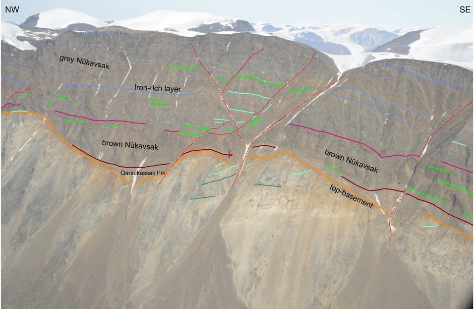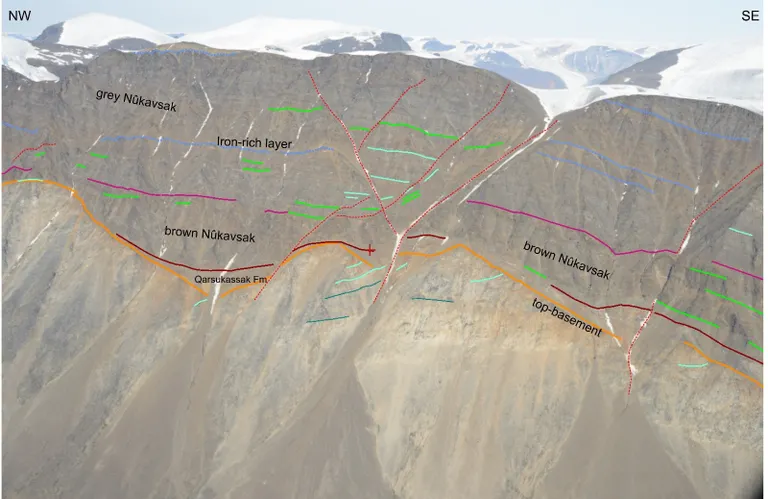 Below, the photogeological mapping of stratigraphical and structural features illustrates the distribution of an horizon controlling the distribution of Zn-Pb mineralization, NW of the RTZ Discovery showing in Kangerluarsuk Fjord, Karrat, West Greenland: