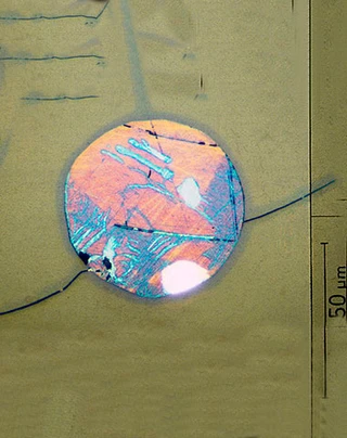 Euhedral crystal of Skaergaardite (sk, PdCu) in sulphide globule and euhedral crystal of tetra auricupride with Cu-sulphide. The two phases contain most of the precious metals contained in the Skaergaard PGE-Au mineralisation.