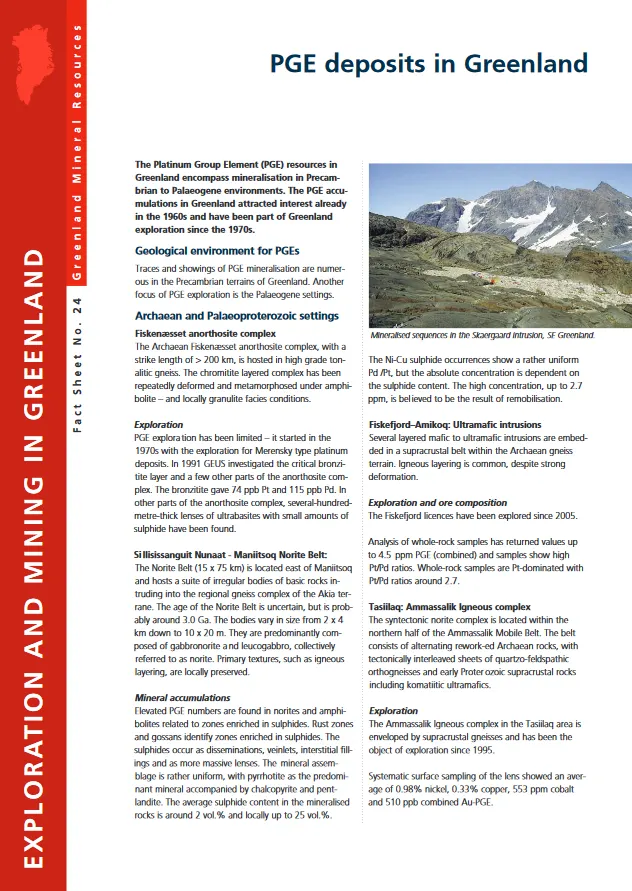 The Platinum Group Element (PGE) resources in Greenland encompass mineralisation in Precambrian to Palaeogene environments. The PGE accumulations in Greenland attracted interest already in the 1960s and have been part of Greenland exploration since the 1970s.