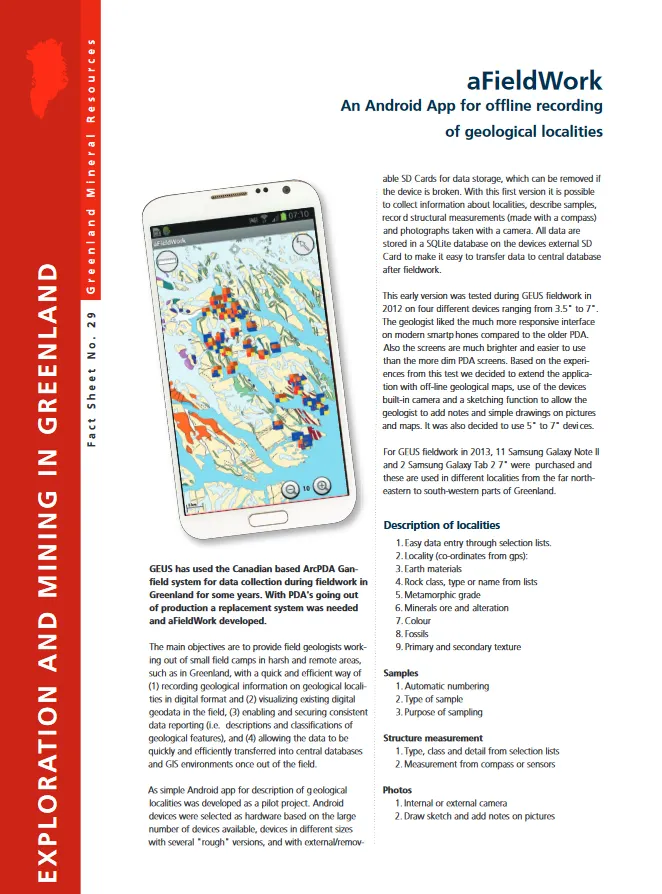 GEUS has used the Canadian based ArcPDA Ganfield system for data collection during fieldwork in Greenland for some years. With PDA's going out of production a replacement system was needed and aFieldWork developed.