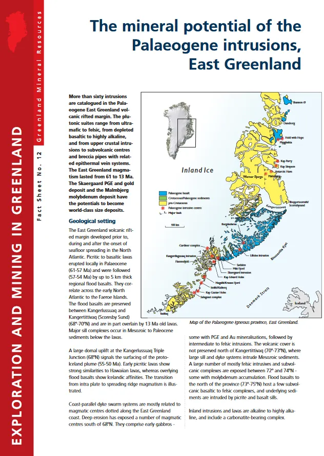 More than sixty intrusions are catalogued in the Palaeogene East Greenland volcanic rifted margin. The plutonic suites range from ultramafic to felsic, from depleted basaltic to highly alkaline, and from upper crustal intrusions to subvolcanic centres and breccia pipes with related epithermal vein systems. The East Greenland magmatism lasted from 61 to 13 Ma. The Skaergaard PGE and gold deposit and the Malmbjerg molybdenum deposit have the potentials to become world-class size deposits.