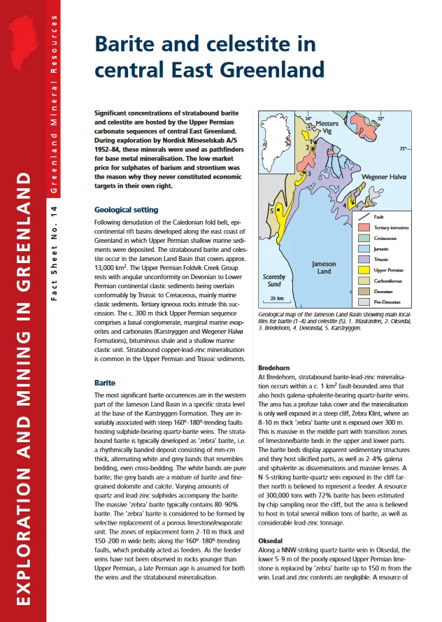 Following denudation of the Caledonian fold belt, epicontinental rift basins developed along the east coast of Greenland in which Upper Permian shallow marine sediments were deposited. The stratabound barite and celestite occur in the Jameson Land Basin that covers approx. 13,000 km2. The Upper Permian Foldvik Creek Group rests with angular unconformity on Devonian to Lower Permian continental clastic sediments being overlain conformably by Triassic to Cretaceous, mainly marine clastic sediments. Tertiary igneous rocks intrude this succession. The c. 300 m thick Upper Permian sequence comprises a basal conglomerate, marginal marine evaporites and carbonates (Karstryggen and Wegener Halvø Formations), bituminous shale and a shallow marine clastic unit. Stratabound copper-lead-zinc mineralisation is common in the Upper Permian and Triassic sediments.