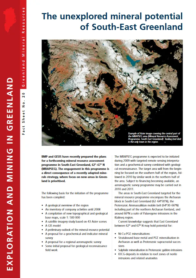 BMP and GEUS have recently prepared the plans for a forthcoming mineral resource assessment programme in South-East Greenland, 62º–67ºN (MRAPSEG). The engagement in this programme is a direct consequence of a recently adapted minerals strategy, where focus on new areas in Greenland is prioritised.