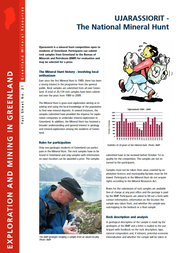 Ujarassiorit is a mineral hunt competition open to residents of Greenland. Participants can submit rock samples from Greenland to the Bureau of Minerals and Petroleum (BMP) for evaluation and may be selected for a prize.