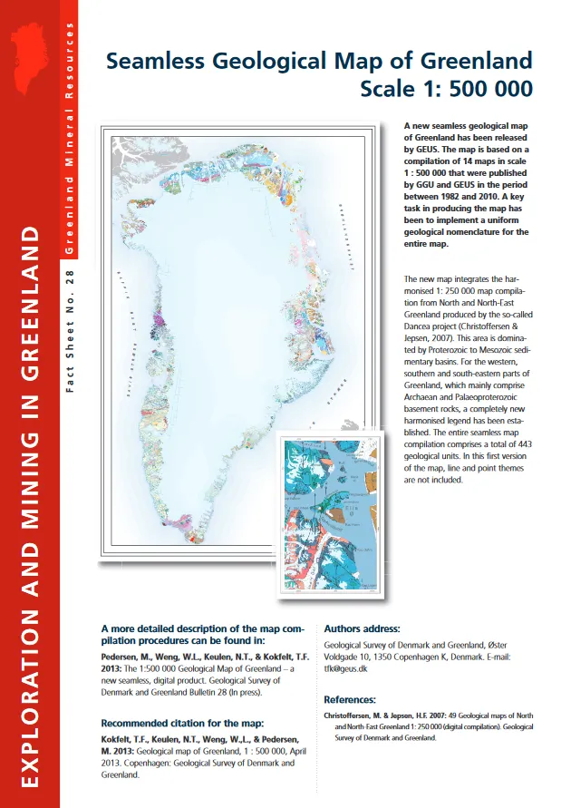 A new seamless geological map of Greenland has been released by GEUS. The map is based on a compilation of 14 maps in scale 1:500 000 that were published by GGU and GEUS in the period between 1982 and 2010. A key task in producing the map has been to implement a uniform geological nomenclature for the entire map.