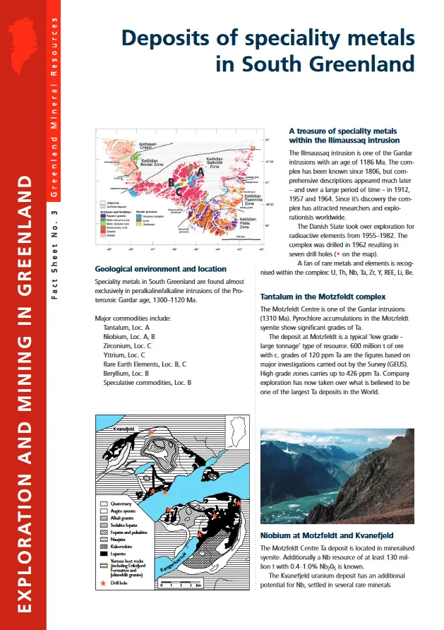 South Greenland has an obvious potential for speciality metals. Characteristically both 'large tonnage - low grade' as well as 'low tonnage - high grade' deposits are outlined. Tantalum takes the lead in the deposit of the Motzfeldt Centre with more than 600 million t of Ta ore grading 120 ppm. Zirconium is found at the exceptional formation at Kangerluarsuk where over 2 million t of Zr ore grading 3% ZrO2 is located. Additional rare metals are Y, Nb, REE, Be and Li.