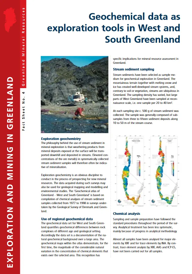 Exploration geochemistry is an obvious discipline to conduct in the process of prospecting for new mineral resources. The data acquired during such surveys may also be used for geological mapping and modelling and environmental studies. The 'Geochemical atlas of Greenland – West and South Greenland' is based on compilation of chemical analyses of stream sediment samples collected from 1977 to 1998 in surveys undertaken by the Geological Survey of Denmark and Greenland.