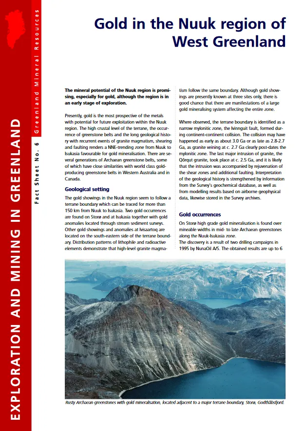 Presently, gold is the most prospective of the metals with potential for future exploitation within the Nuuk region. The high crustal level of the terrane, the occurrence of greenstone belts and the long geological history with recurrent events of granite magmatism, shearing and faulting renders a NNE-trending zone from Nuuk to Isukasia favourable for gold mineralisation. There are several generations of Archaean greenstone belts, some of which have close similarities with world class goldproducing greenstone belts in Western Australia and in Canada.