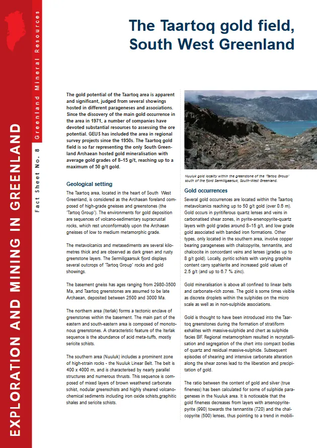 The gold potential of the Taartoq area is apparent and significant, judged from several showings hosted in different parageneses and associations. Since the discovery of the main gold occurrence in the area in 1971, a number of companies have devoted substantial resources to assessing the ore potential. GEUS has included the area in regional survey projects since the 1950s. The Taartoq gold field is so far representing the only South Greenland Archaean hosted gold mineralisation with average gold grades of 8–15 g/t, reaching up to a maximum of 50 g/t gold.